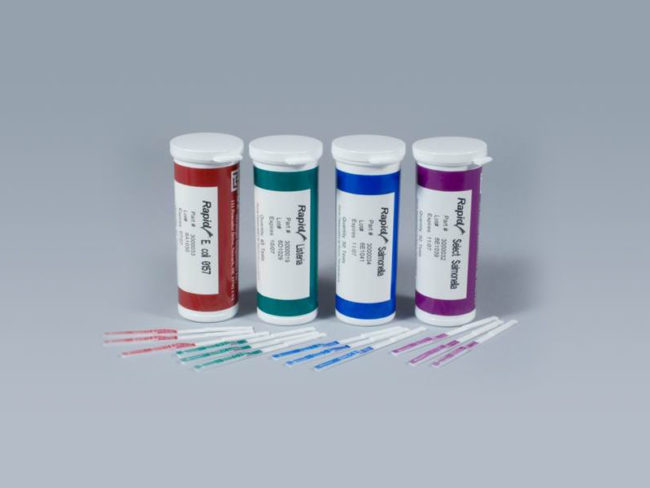 생고기, 가공식품등 다양한 시료속에 Samonella, Listeria와 같은 병원성 세균을 검출하는 lateral flow test strip입니다.